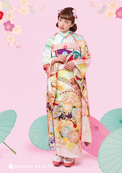 ころころ散らばる菊に合わせて、髪飾りもまんまるに。アクセントの水色で爽やかさもプラス。