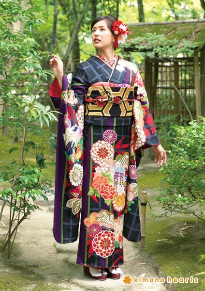 深い色の格子に紫の縁取りが印象的。亀甲の帯に赤で統一した小物を使い、気品ある振袖姿に。