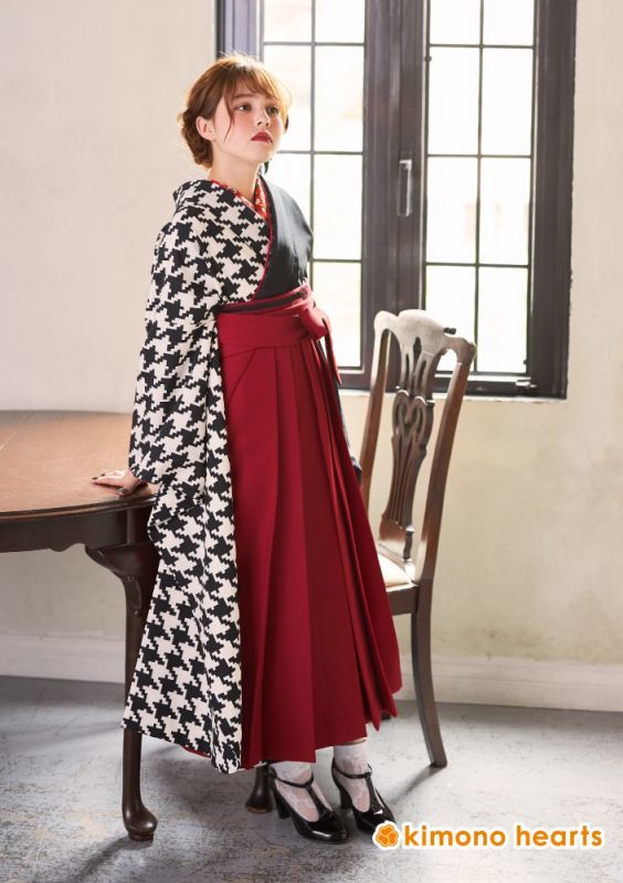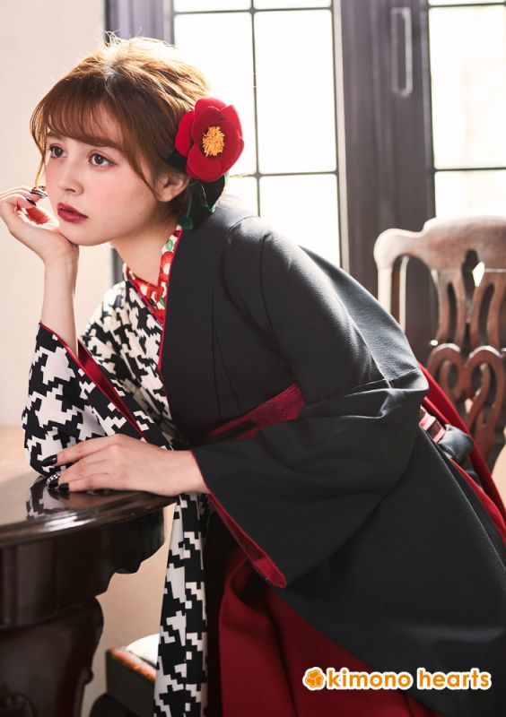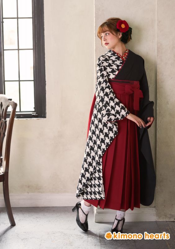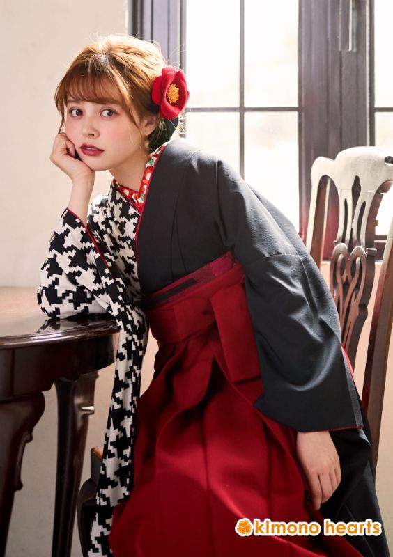 千鳥格子と無地の半身がお洒落な、キモノハーツオリジナル振袖。無地が多くシックなのに目を引きます。
