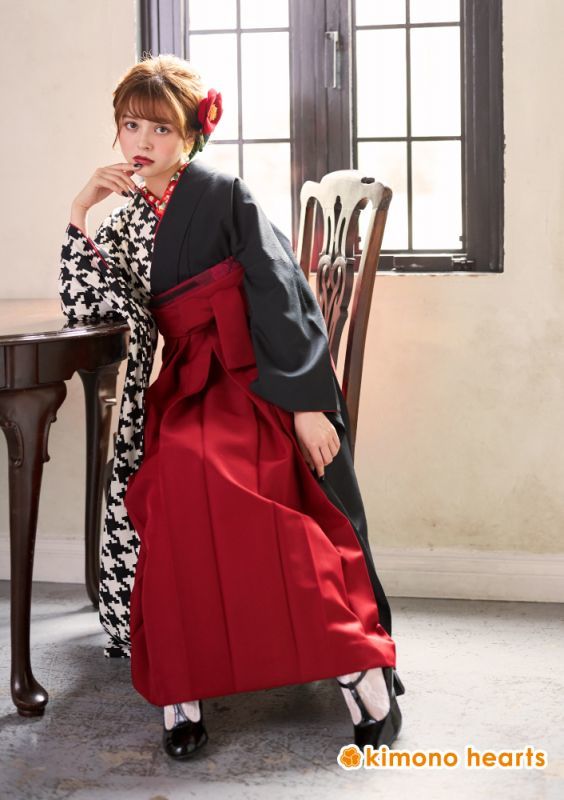 袴はエンジ色を合わせて落ち着いた色合いに。