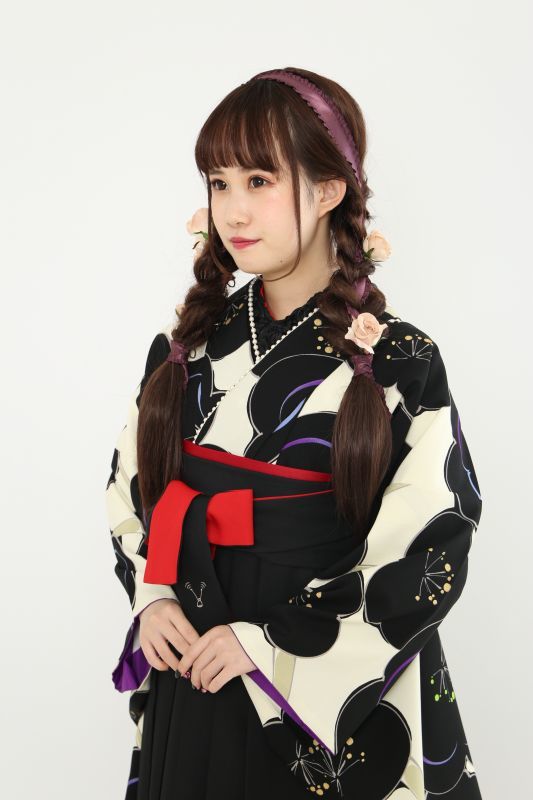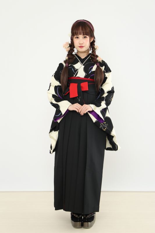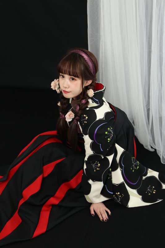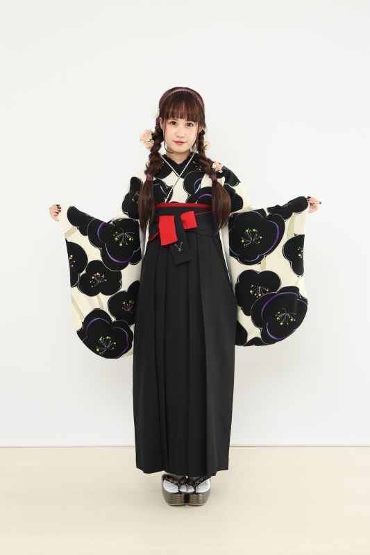 オフホワイトに大きな黒い梅に黒い袴でゴシックな雰囲気に。袴のプリーツ地に赤色が入っており、 動きがあるたびに黒と赤のコントラストがお洒落で個性的です。