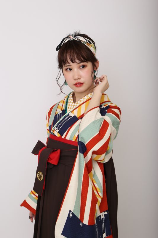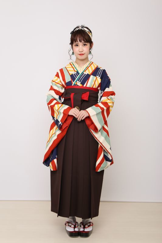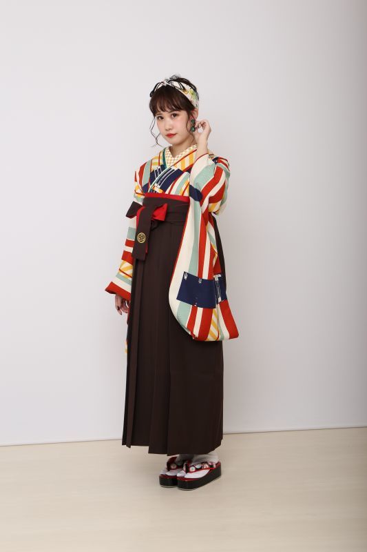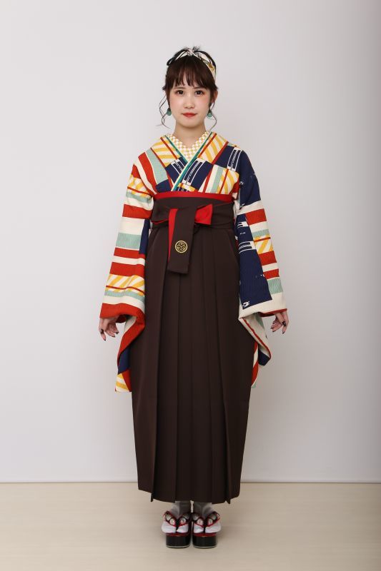 モダンアンテナさんのお洒落な二尺袖にキモノハーツオリジナルのマカロン袴。 茶色の袴はお紐が赤色で、お洒落になります。