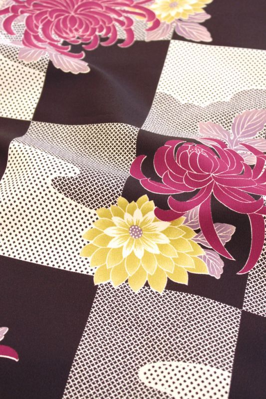 卒業式 袴セット 二尺袖 (市松模様と菊 こげ茶) × 袴 (白)