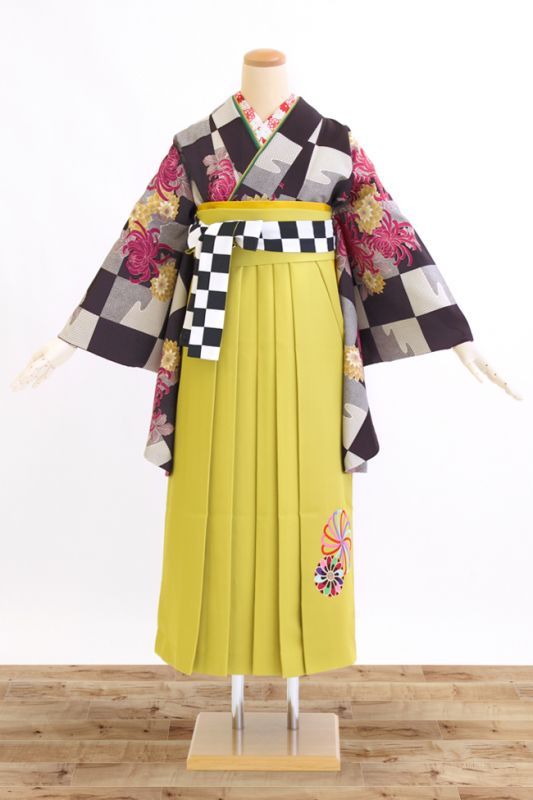 こげ茶×白の市松模様の二尺袖(小振袖)と黄緑の刺繍入り袴のセット。必要なものが全て揃った安心のフルセットです。