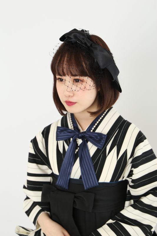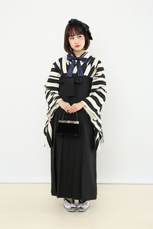 はいからさんみたいな矢羽柄の二尺袖に無地の黒袴。黒で統一してゴシックやモードな雰囲気に。