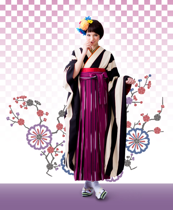 太めの縦縞が個性的なモダン振袖。縞の間にのぞくレッドラインがスタイリッシュアクセント。袴は紫でシックに。