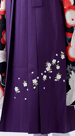 アンティーク風の鶴の柄が印象的。黒と赤のコントラストが綺麗な振袖に、桜の刺繍の袴を合わせました。
