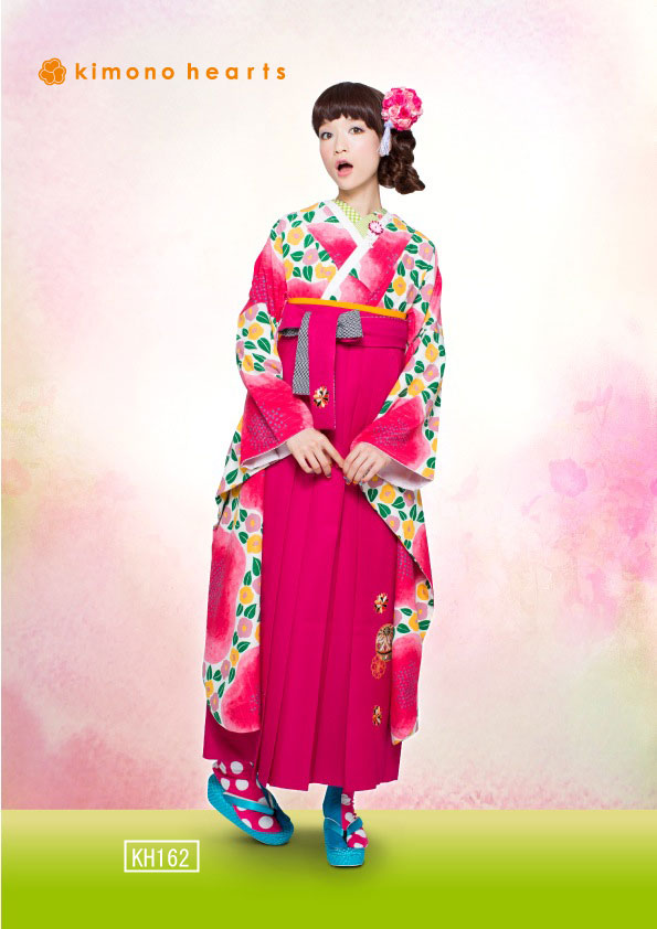 ピンクの大梅に彩椿が可愛い振袖です。ローズに七宝柄の袴で可愛さが引き立ちます。