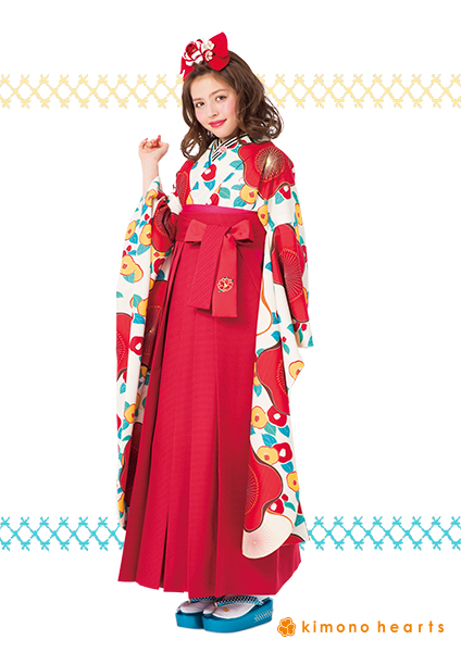 コロンとした大小のカワイイ椿柄の振袖にスパイラルガールの赤系ハカマをチョイス。卒業式はガーリーコーデでキマリ!