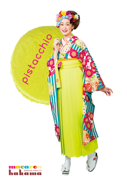 パッと目を引くターコイズのストライプ振袖にキモノハーツオリジナルハカマ【マカロンシリーズ】のPistacchio/ピスタチオチョイス。 明るい組み合わせが卒業気分を盛り上げます。