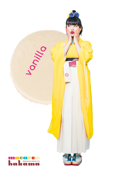 黄色にラインのオシャレな振袖にキモノハーツオリジナルハカマ【マカロンシリーズ】の