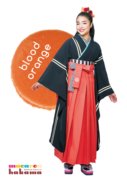 黒字にラインのオシャレな振袖にキモノハーツオリジナルハカマ【マカロンシリーズ】の Orange/オレンジを合わせました。 人気シリーズのコラボをどうぞご堪能下さい。 ※着用年度によりお受けできない場合がございます。