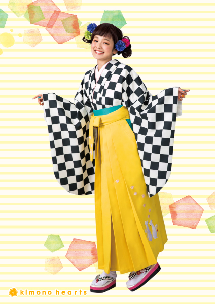 白×黒の市松模様のモダンな二尺袖袴はマスタードを選んでオシャレ度アップ。