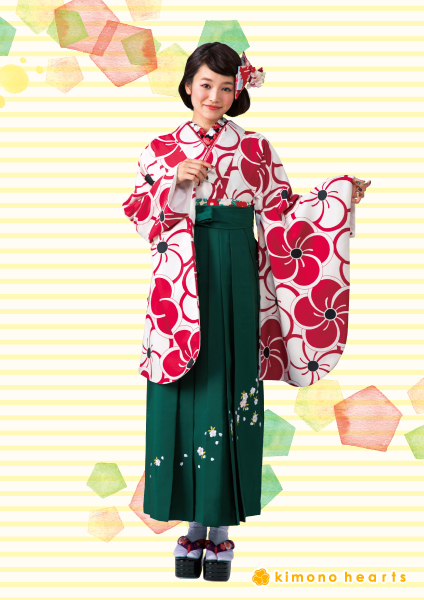 真っ赤なねじり梅がレトロ可愛い二尺袖赤と相性がいい深い緑の袴でメリハリコーデ。