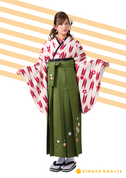 卒業式の定番、矢羽柄に花柄をプラスこっくりした抹茶色の袴を合わせた大正浪漫コーディネート