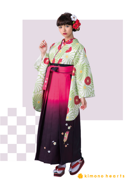 若草色の万寿菊柄の二尺袖と袴はローズ色のグラデーションに矢羽の柄。