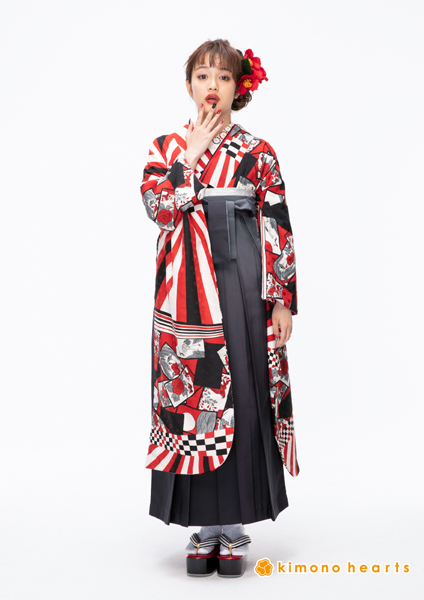 深めの赤と黒白で配色されたキモノハーツオリジナルの花札振袖袴はとことん渋く、かっこよくグレーのグラデーションでお洒落に 髪型次第でモードにも派手にもできるスタイルです