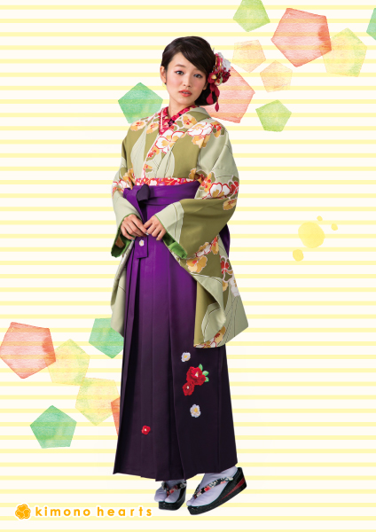 シックな抹茶色にさりげない花柄のレトロな二尺袖袴は紫のグラデーション