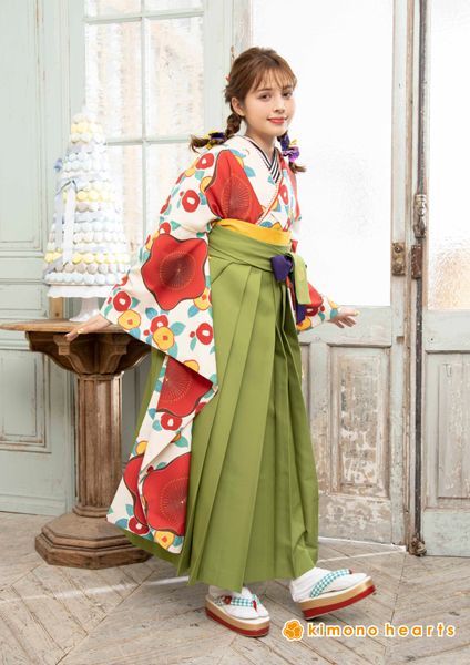 クリーム地に大きな椿と小さな椿が可愛いレトロ振袖袴は抹茶色で大人っぽく、だけどお紐は紫でお洒落に。 可愛いけど上品なキモノハーツオリジナル袴スタイルです。 人気シリーズのコラボをどうぞご堪能下さい。