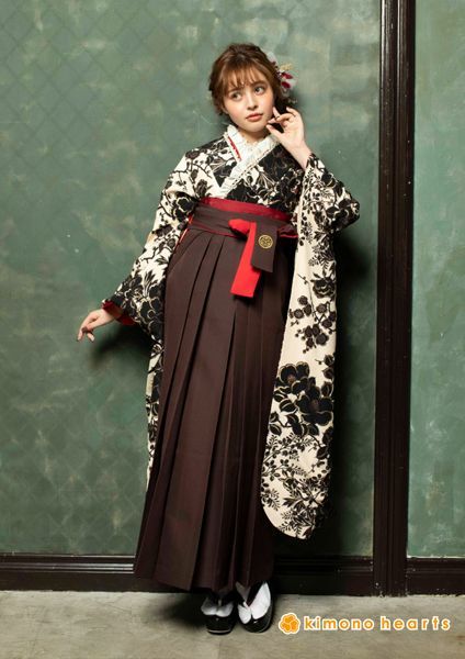 クリーム色に黒色の花柄がシックなアンティーク調のお振袖袴も茶系のショコラ色を合わせてノスタルジックな雰囲気もでます。