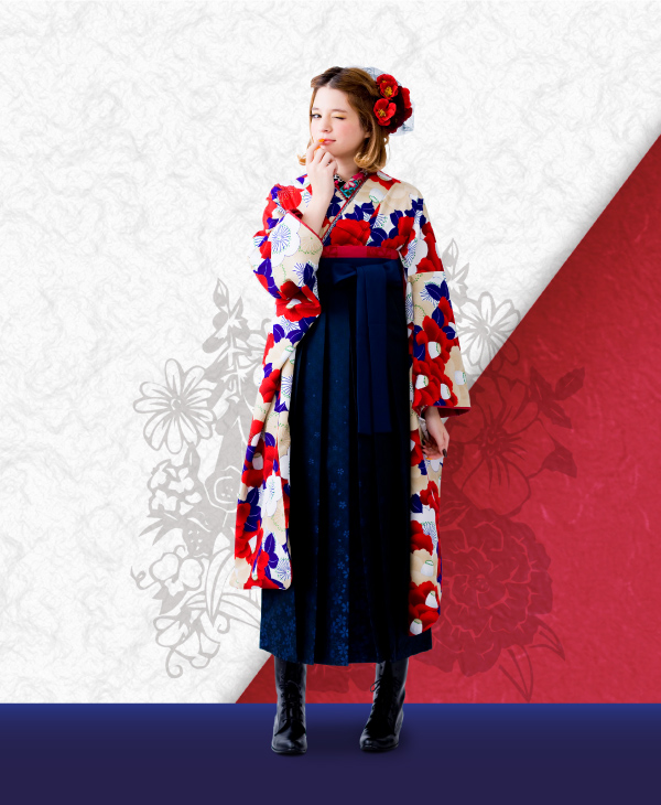 人気岡重椿柄振袖のベージュ版。落ち着いた色合いに、真紅の椿が映えます。袴は紺でシンプルに。